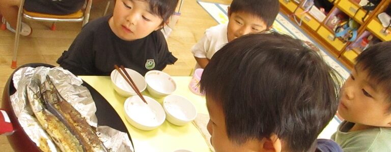 保育室で秋刀魚の本来の姿をお子さま達に見せ、その場で焼いて