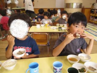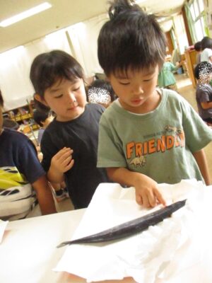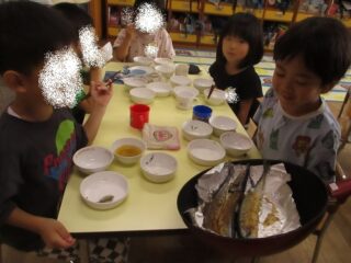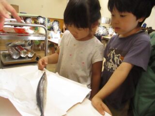保育室で秋刀魚の本来の姿をお子さま達に見せ、その場で焼いて